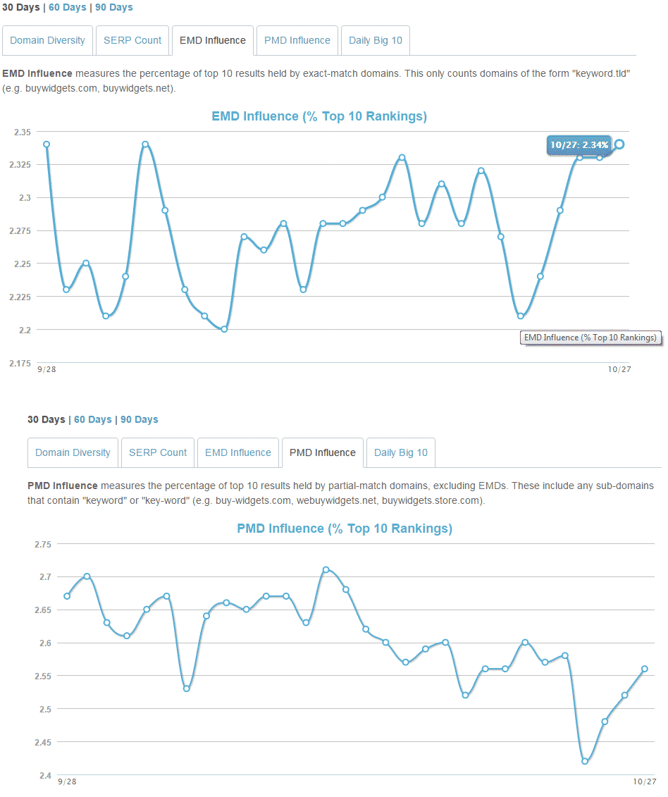 While on the 22nd October - the EMD influence (frequency of exact match domains found in the higher SERPs) dropped to its lowest levels within the period - a week later (27/10/2014) this discovery is turning back in a very bullish manner towards its highest peak.