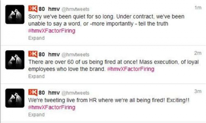 Back in January, HMV declared that they were going into administration. Inevitably, the company and its employees were facing some tough times. Well, the company’s crisis was about to get a whole lot bigger when a fired community manager decided to take matters into their own hands and ‘live’ tweet the company HR meeting under the hashtag #hmvXFactorFiring. The tweets were soon trending worldwide, with over 700 tweets being sent about the situation in the first 30 minutes.
