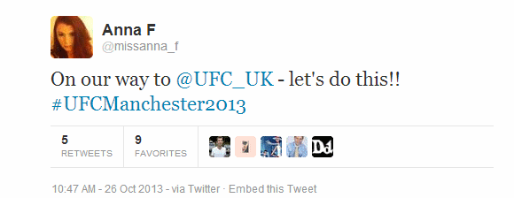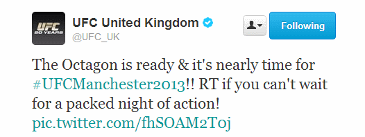 So what surprises me is, when I turn up to a UFC event I am already tweeting away, but using what hashtag? Well I usually try and find out what other people are already using, and this time I stuck with #UFCmanchester2013, but again there was confusion when I saw the hashtag #UFCFightNight