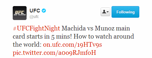 A few days before each event, the company also gives fans a chance to get free tickets, with an integrated Twitter competition. They tweet out a clue using the hashtag #Hunt4UFC as to where a fighter is hidden with a free ticket, and Twitter users can then try and find them first in an attempt to win. I really like this idea, as it uses both offline and online engagement.
