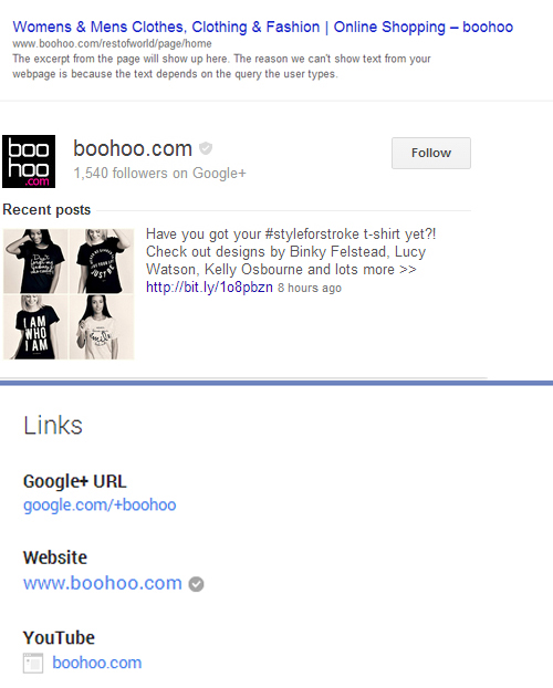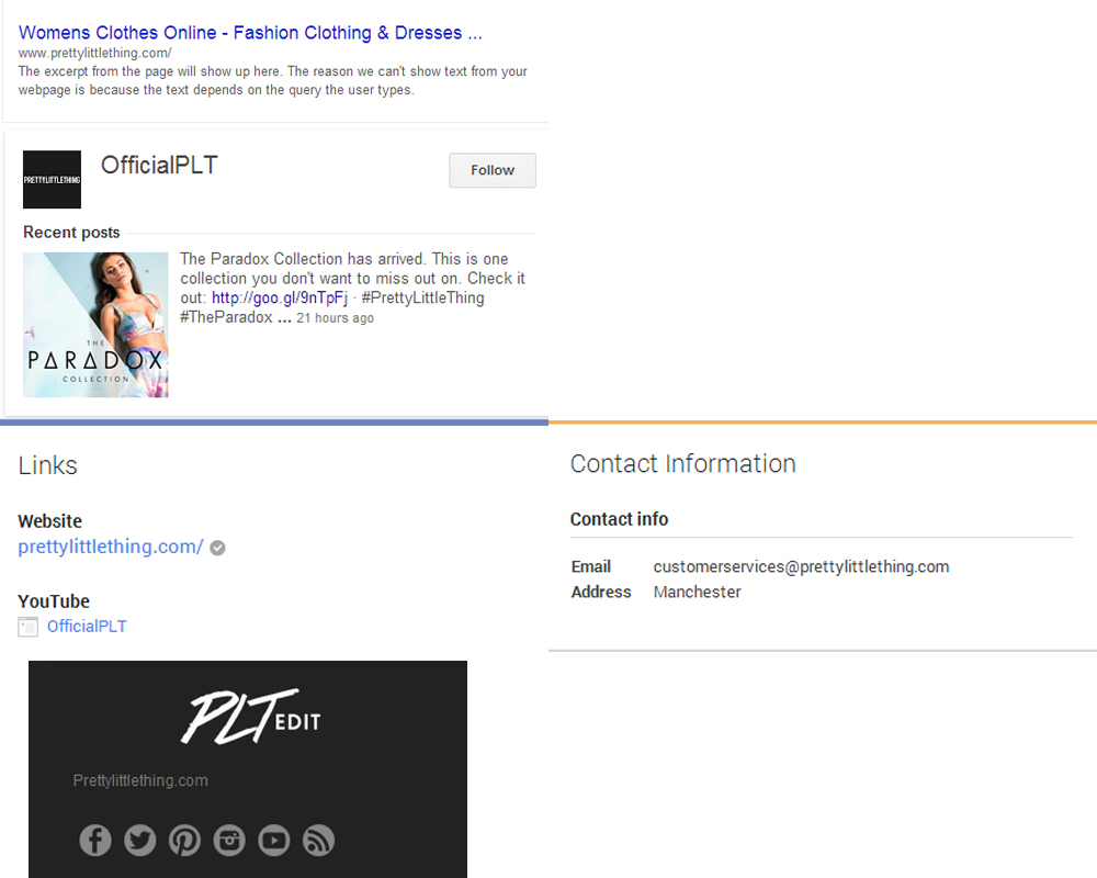 Pretty Little Thing (PLT) does have a Google+ page, has verified its site and is appearing within the Knowledge Info Panel.