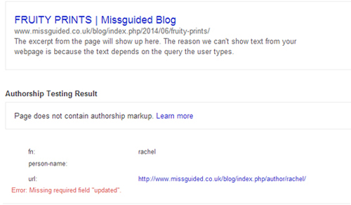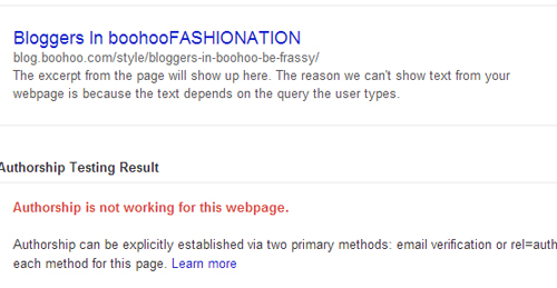 Boohoo has tried to use author markup, but has used rf data to do this and so have failed to be recognised by Google. As a result, the author does not display in SERPs.