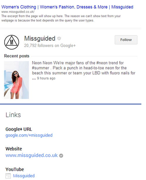Missguided provides the perfect example of the importance of choosing your brand name when deciding to create your Google+ page. Unlike in search, where Google will display misspellings and synonyms, it does not do this in the knowledge info panel.