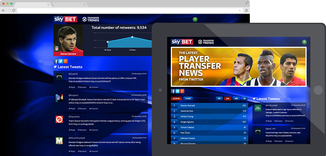 In December 2013, Sky Bet approached Blueclaw to build them a tool which would collate all the hottest football transfer news from Twitter to engage and access the buzz around the 2014 January and summer transfer windows.